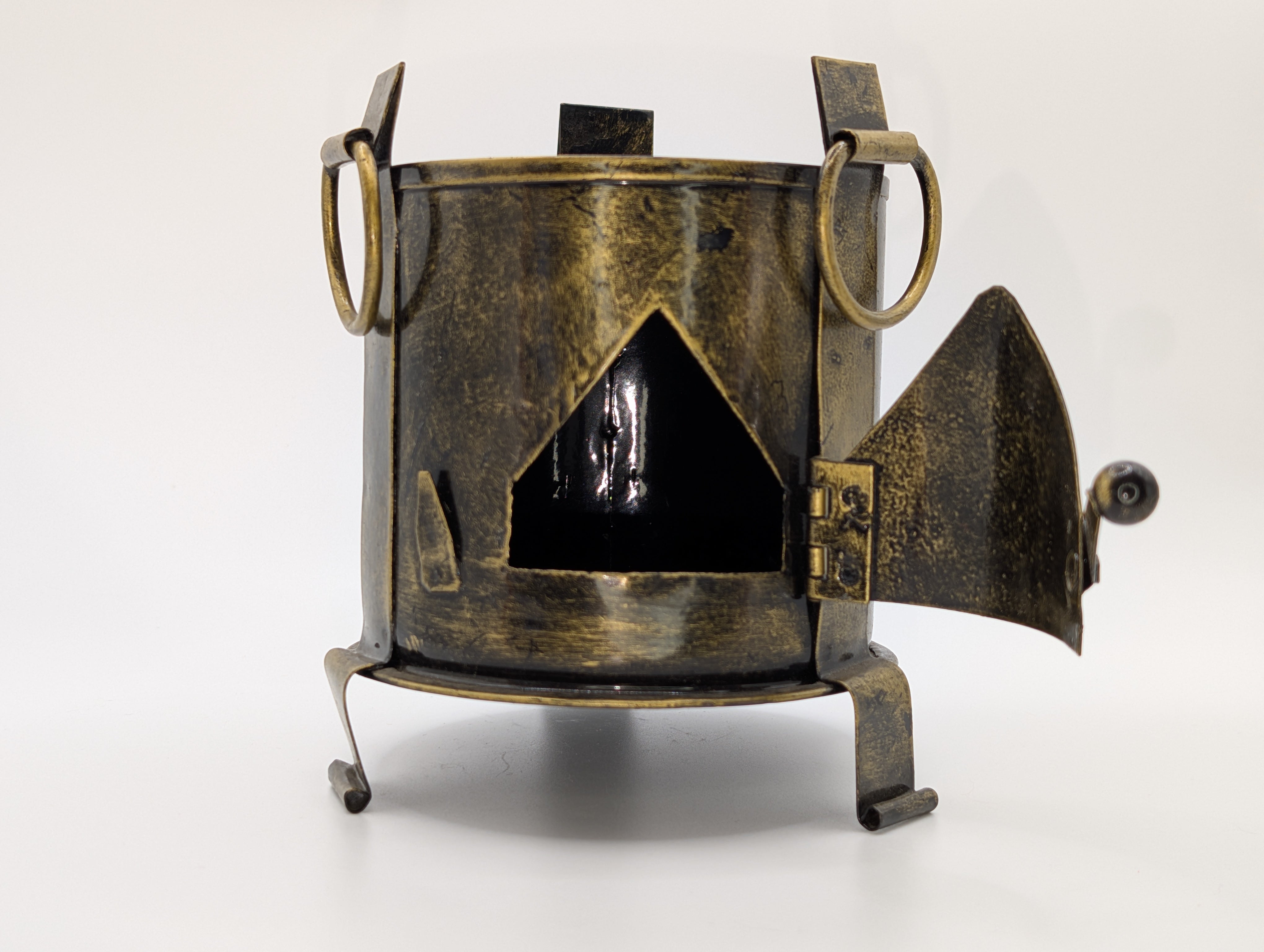Traditional shegdi (village stove) silhouette with curled legs, ring handles, and hinged front panel |