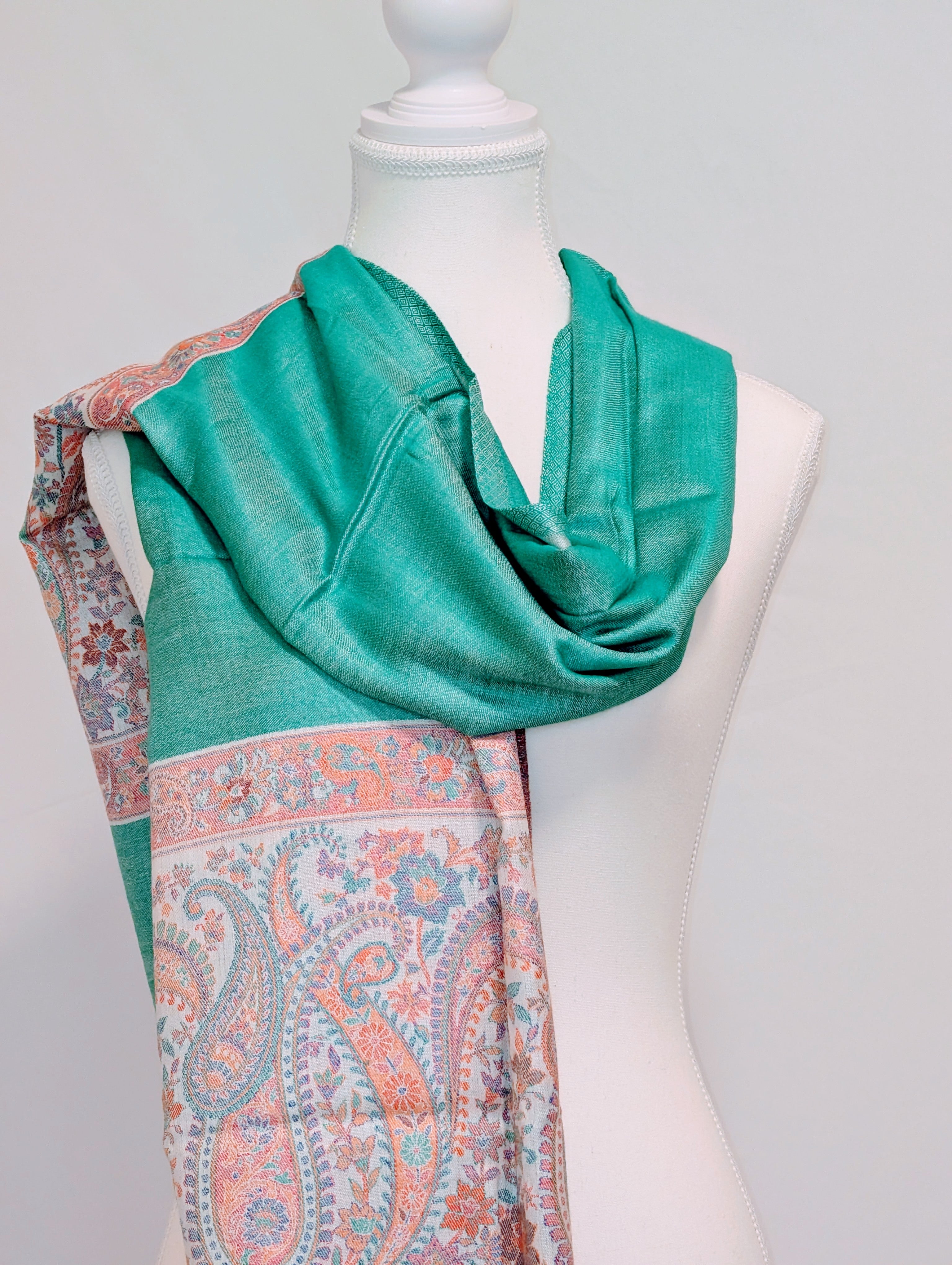 Defined by Emerald with Ivory Paisley Border, this shawl is crafted from an ultra-premium Kashmiri cashmere blend (pashmina-blend ) designed to enhance durability without compromising the exquisite softness and luxury of pure cashmere.