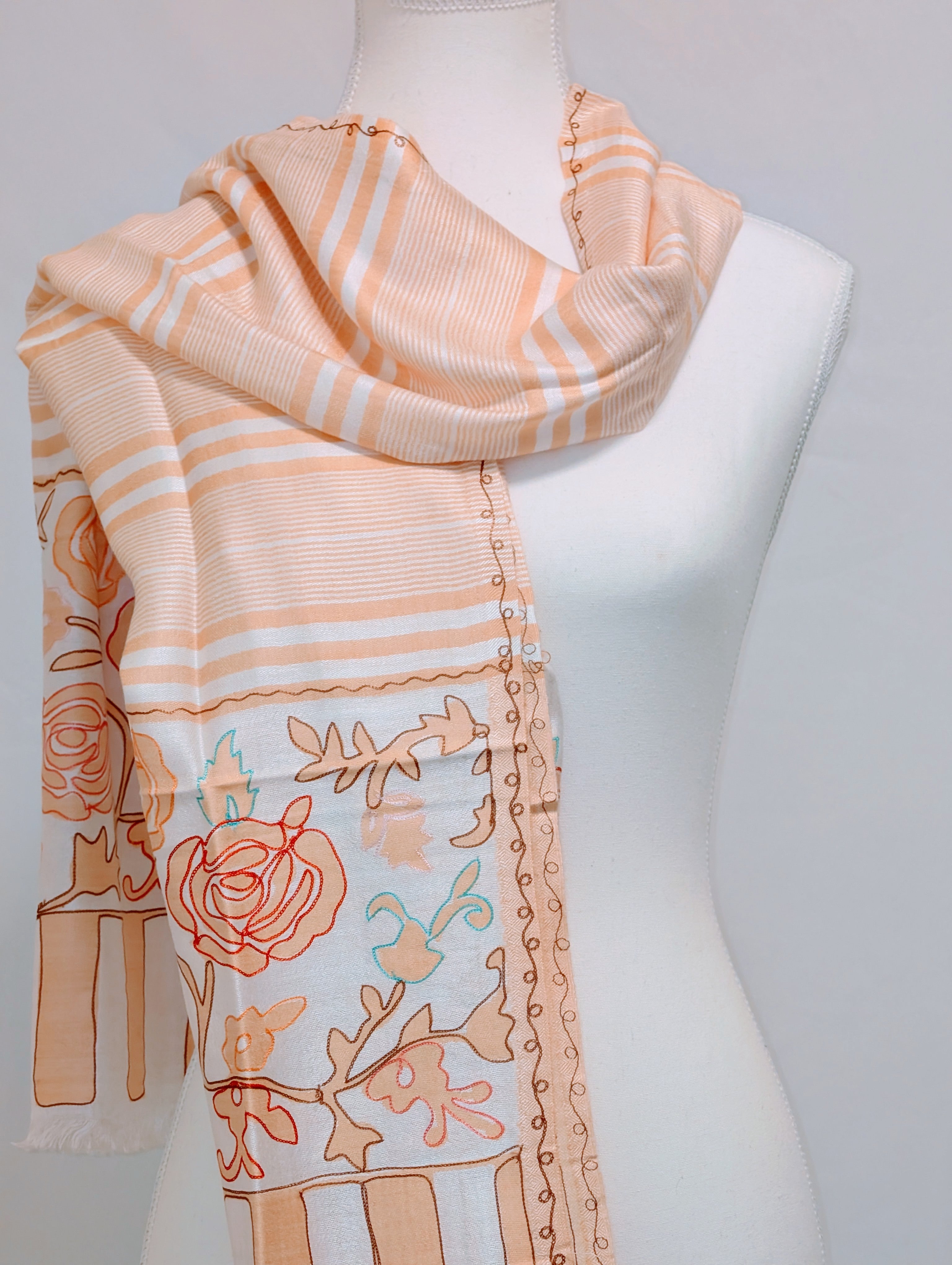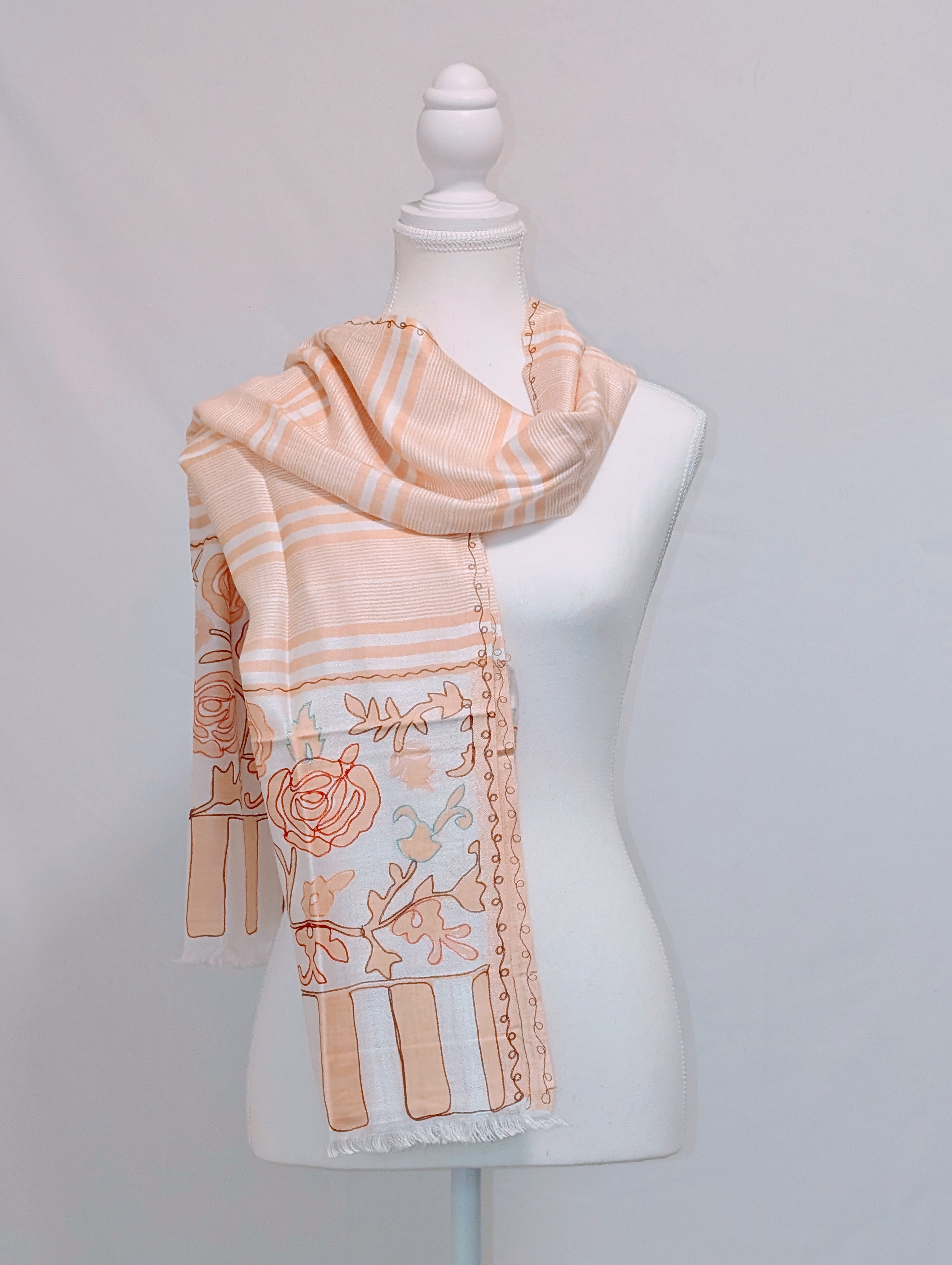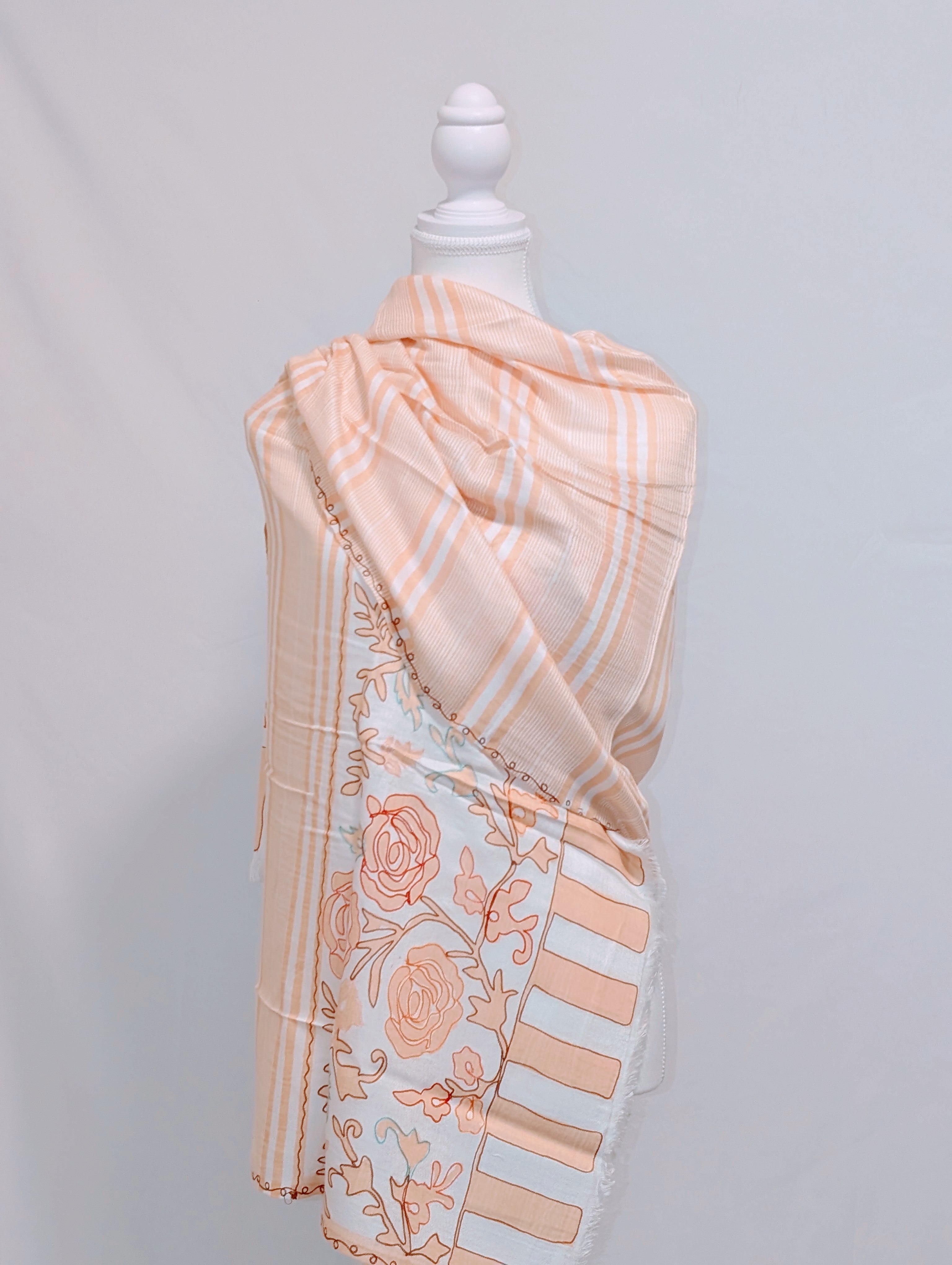 Defined by Soft Peach with Floral & Stripe Border, this shawl is crafted from an ultra-premium Kashmiri cashmere blend (pashmina-blend) designed to enhance durability without compromising the exquisite softness and luxury of pure cashmere.