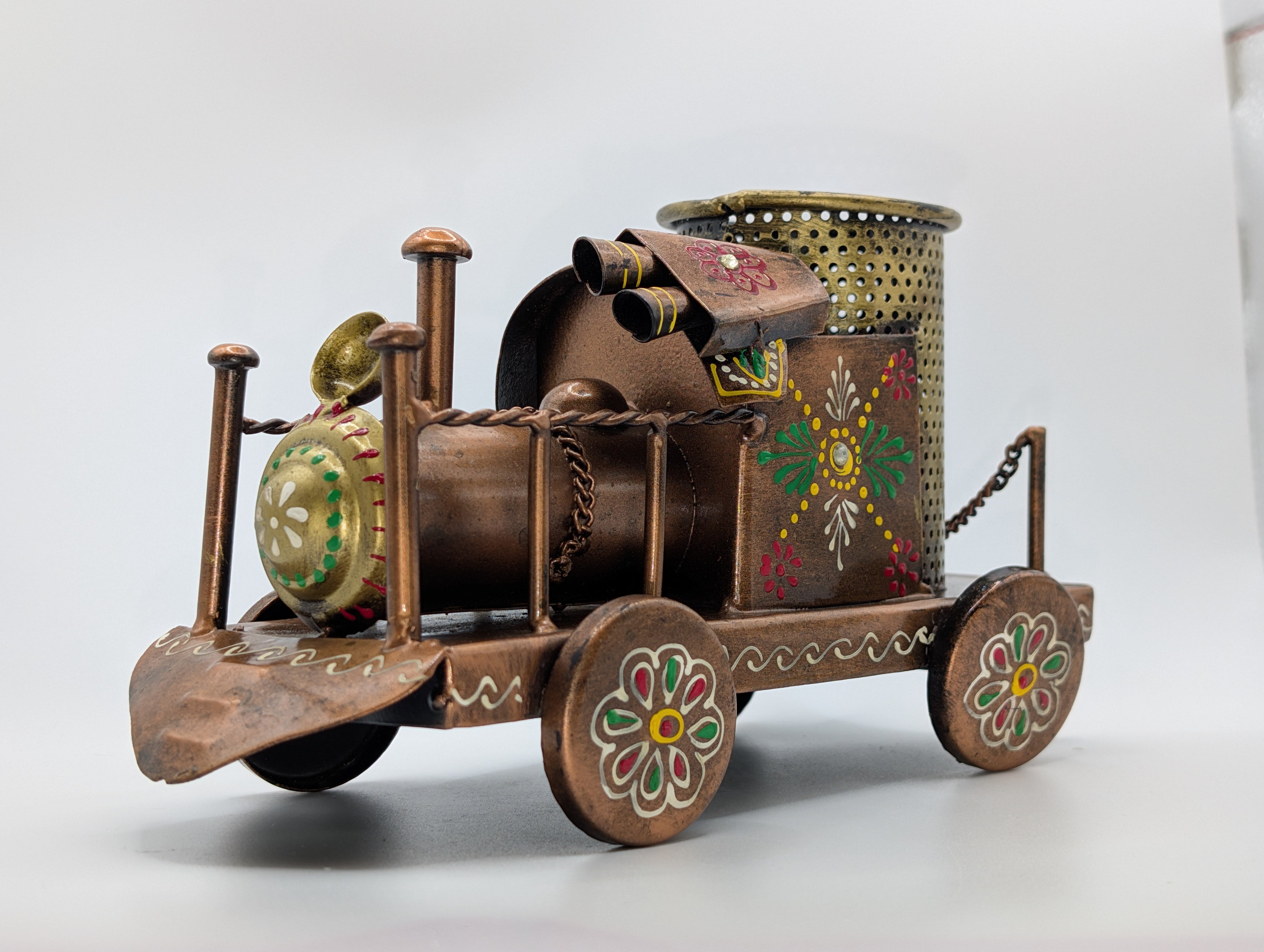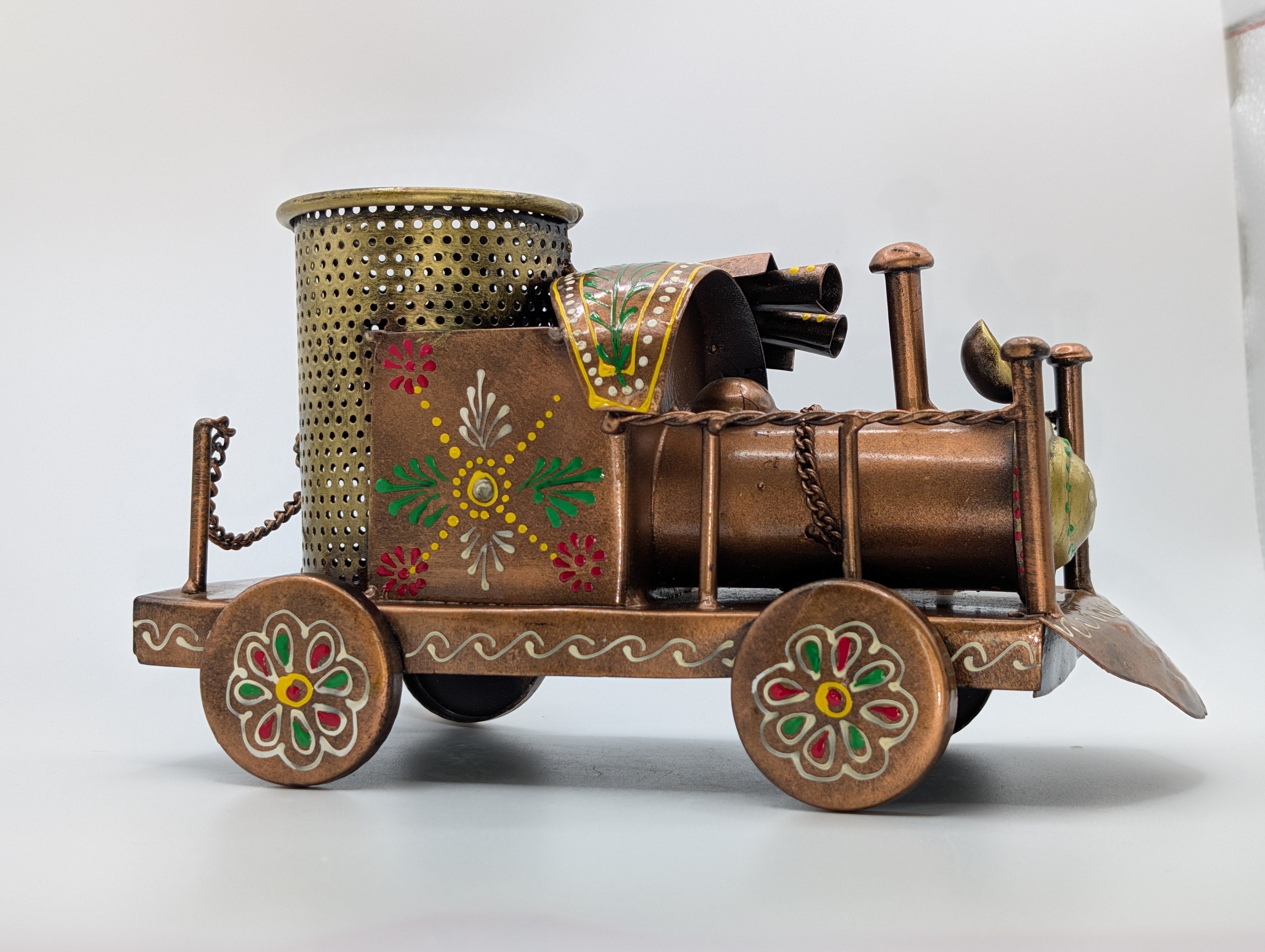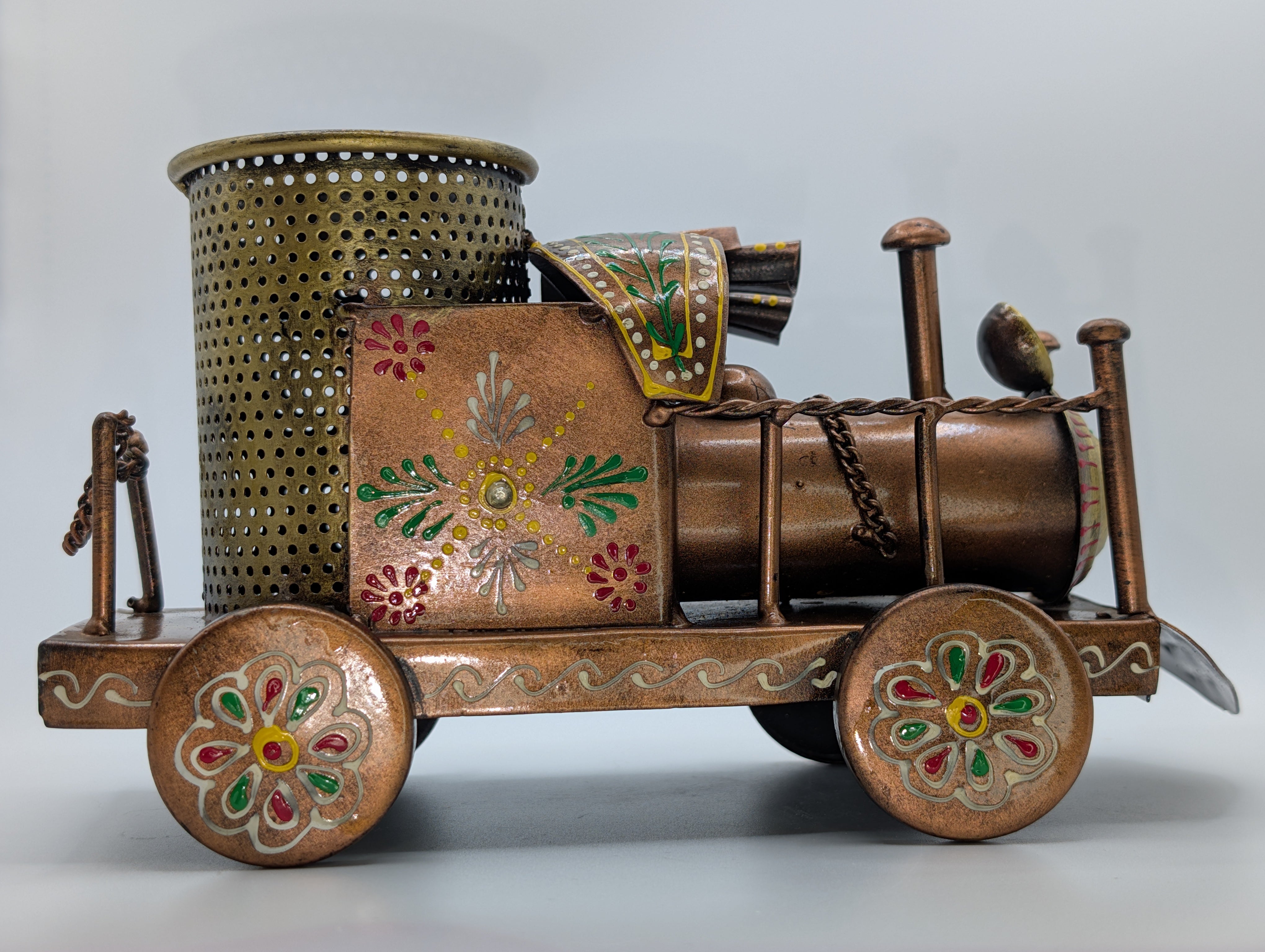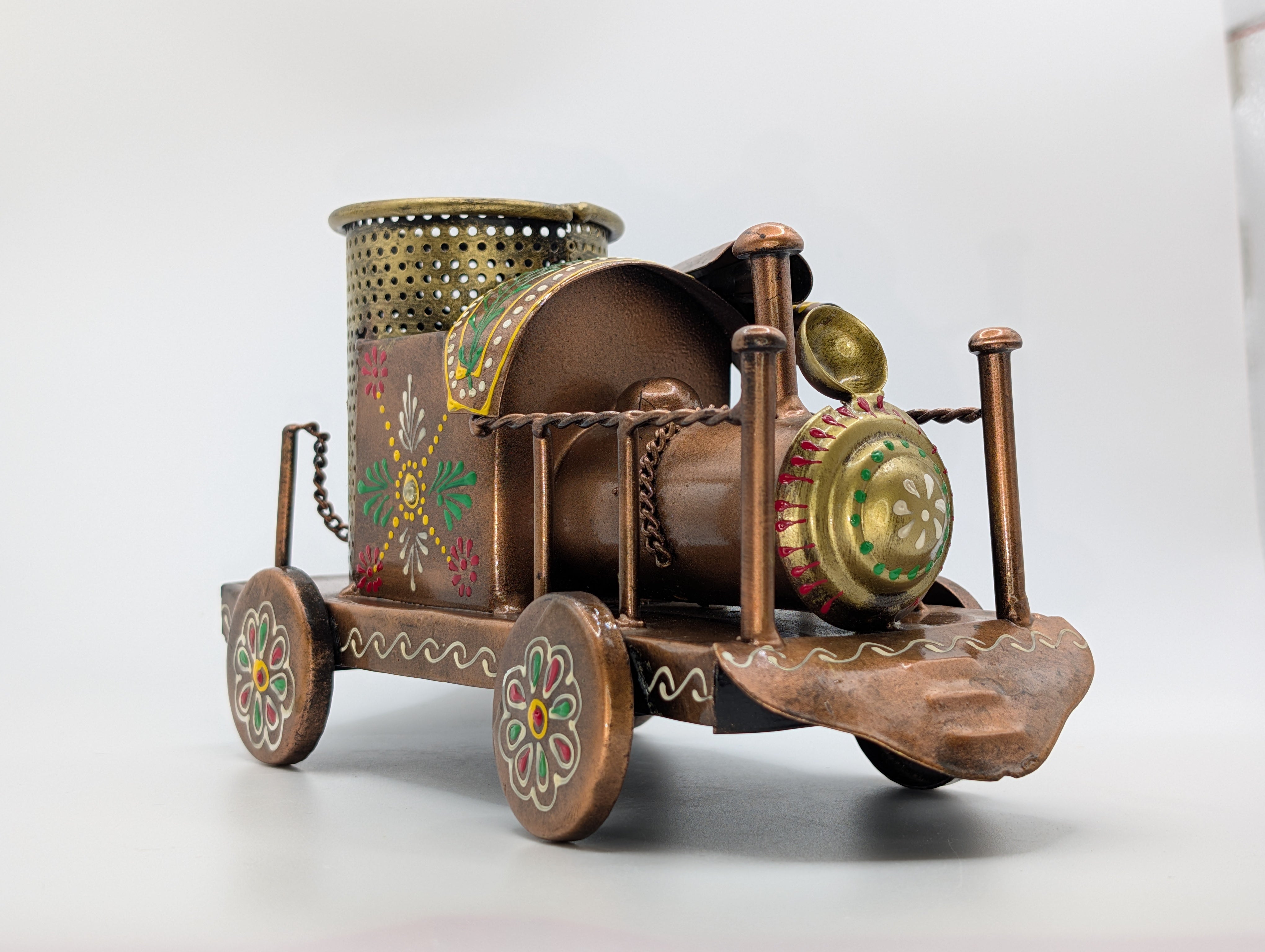Exquisite Hand-Painted Metal Pen Stand - Steam Engine — Handmade Indian Artisanal